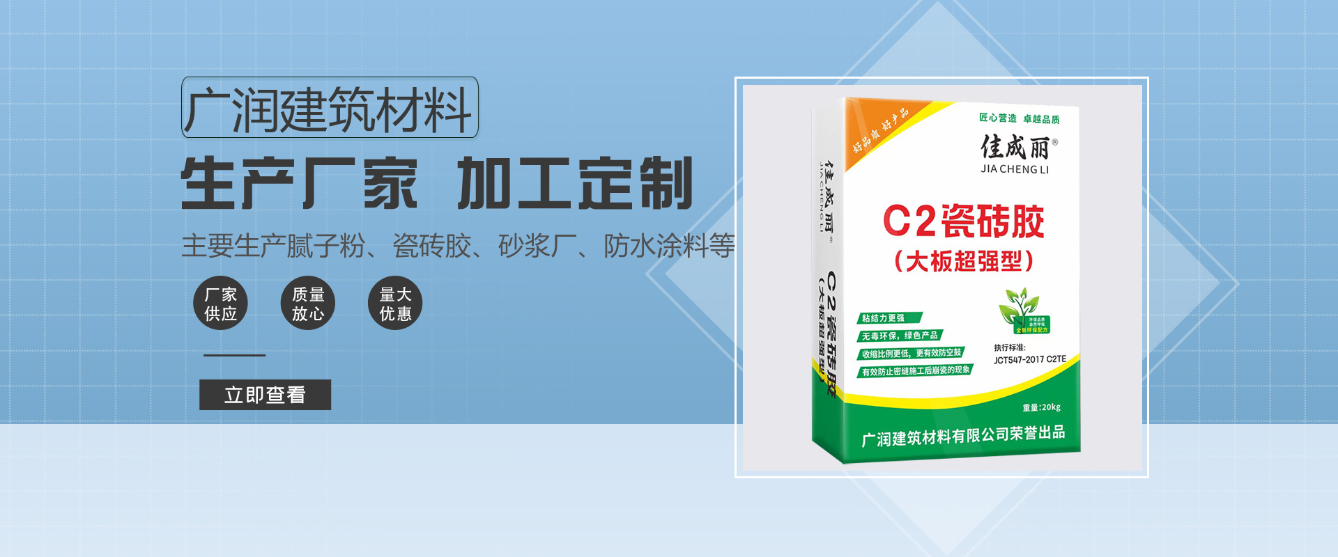 廣西廣潤建筑材料有限公司一直致力于高品質(zhì)的新型膩子的研制,已取得了多項科研成果。開發(fā)出一系列廣受市場歡迎的涂料產(chǎn)品,集研發(fā)、生產(chǎn)、銷售于一體的建筑材料制造企業(yè)。廣西廣潤建筑材料有限公司會聚了具豐富經(jīng)驗的專業(yè)技術(shù)人才及高素質(zhì)的管理隊伍。主要從事生產(chǎn),水性環(huán)保鋼化膩子粉,外墻彈性、柔性、抗裂型膩子粉、內(nèi)墻防水膩子粉等中高檔建材產(chǎn)品。廣西廣潤建筑材料有限公司開業(yè)至今,本著“求實、進取、信譽為本、客戶至上”的宗旨,積極開拓業(yè)務,取得了優(yōu)異成績,……